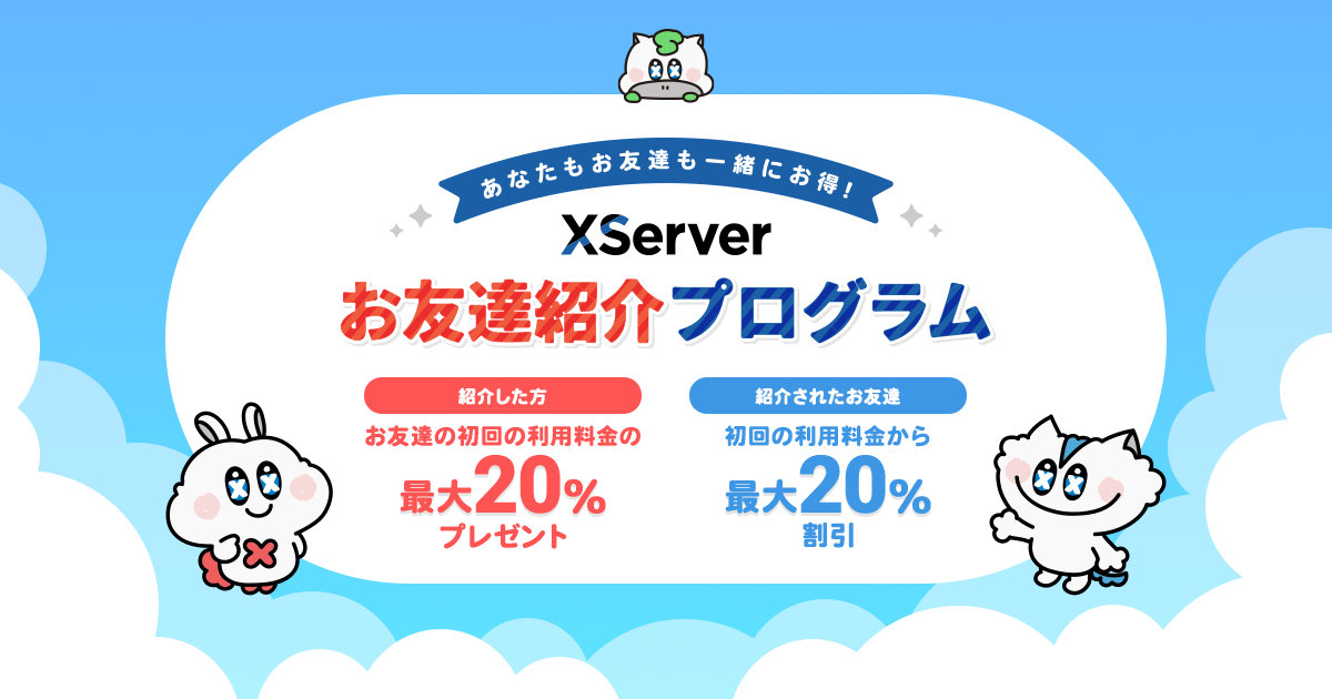 「お友達紹介プログラム」は、紹介された人がエックスサーバーに新規で申し込むと、初回の利用料金が最大20%割引される特典です。